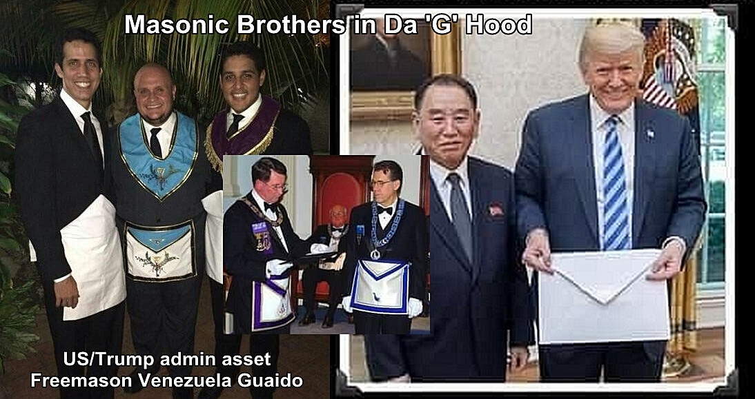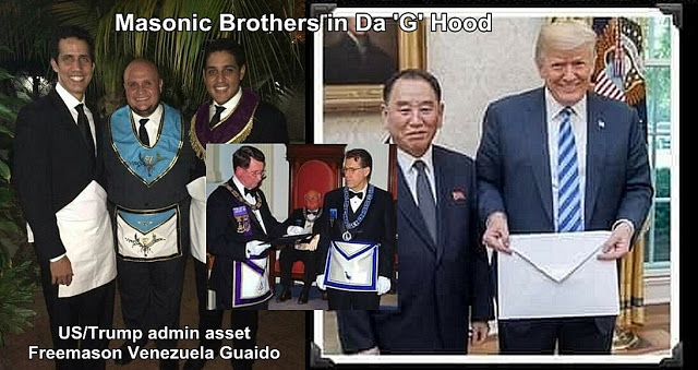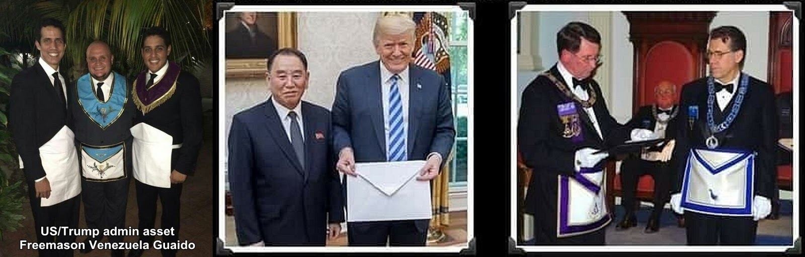 Masonic Trump and the masonic (envelope) apron. Profane mockery, as is typical. Trump asset, masonic Guaido (left).