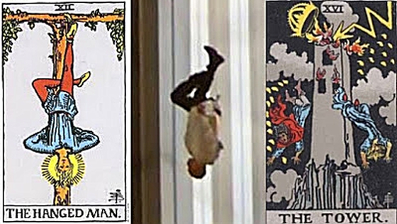 Twin Towers "reduced to rubble" via Patrick '33 (k)Nick' Ewing. The Hanged (Tower) Man via Exorcist 3.