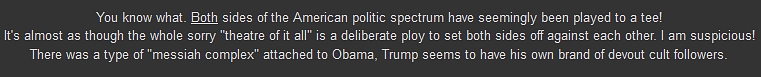 My comment/suspicions after 1 year of Trump being in office (Jan 2018). Sides set-off against each other - think civil war.