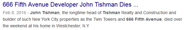 Tishman did the (6660) WTC rebuild, the son of 666 Fifth Ave. and Twin Tower building, (Jewish) John Tishman.