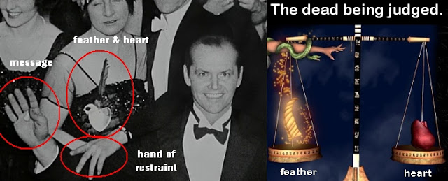 Now look at the woman in the photo....look at the single feather & the heart.  I think she is referencing the Feather of Maat.
