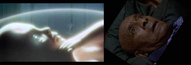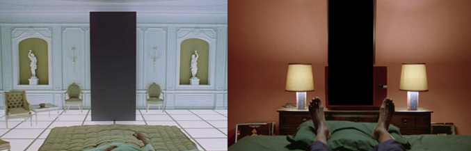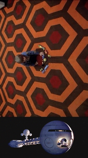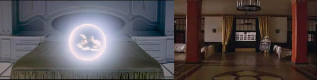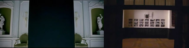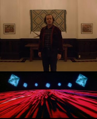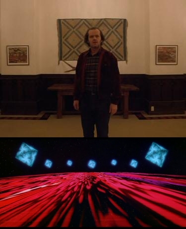 To begin with I'm going to show with pictures (the synched videos will come later).  We're basically taking just over the last minute & a half (1:32 or 92 secs) of the ending from each of these films and using the 'passing thru the monolith' & 'passing through the Overlook lobby doorway' as a fixed anchor point from each, basically so each of those moments coincides when either meshed/overlaid or side by side.