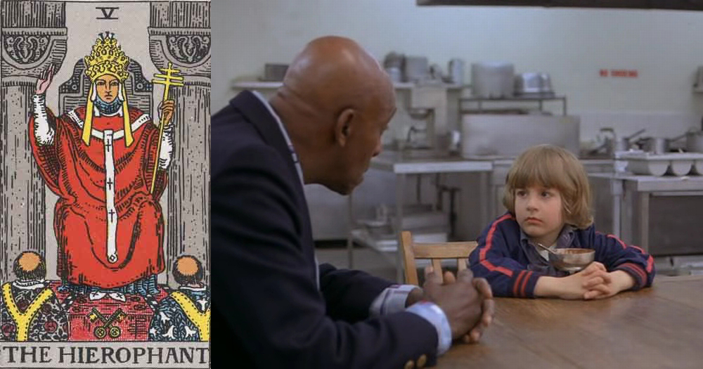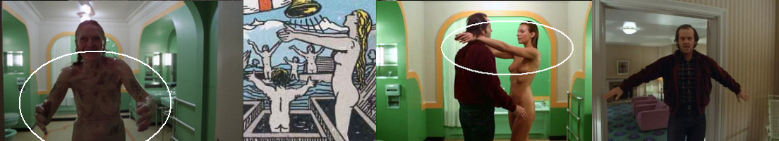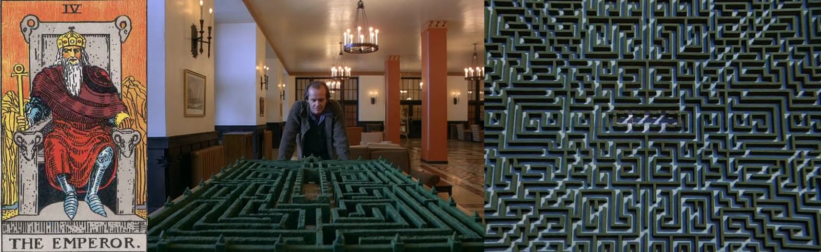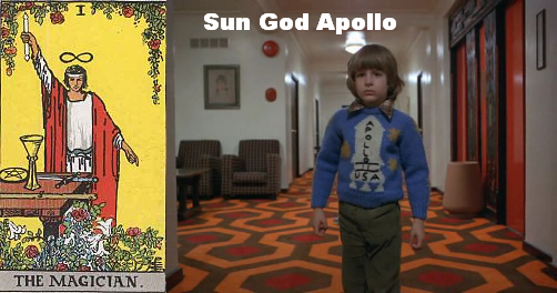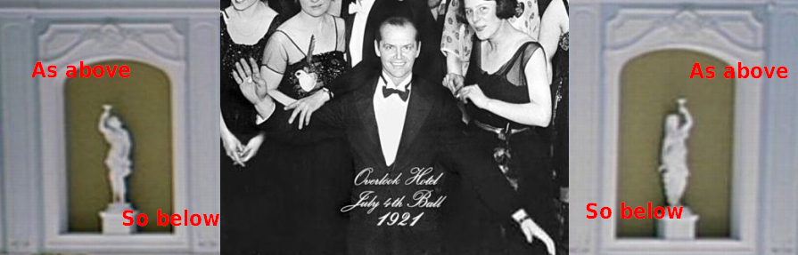 This phrase comes from the beginning of The Emerald Tablet (think...monolith/Oz, see pic) and embraces the entire system of traditional and modern magic which was inscribed upon the tablet in cryptic wording by Hermes Trismegistus. The significance of this phrase is that it is believed to hold the key to all mysteries. All systems of magic are claimed to function by this formula. "'That which is above is the same as that which is below'...Macrocosmos is the same as microcosmos. The universe is the same as God, God is the same as man, man is the same as the cell, the cell is the same as the atom, the atom is the same as...and so on, ad infinitum."    Apply that to the endings of each of these films, 2001 'macrocosm' (above in space, looking down on the world) ans The Shining 'microcosm' (below, on the earth).
