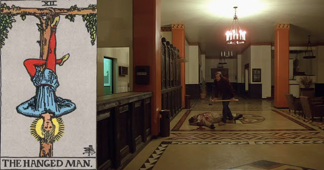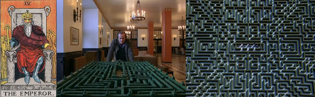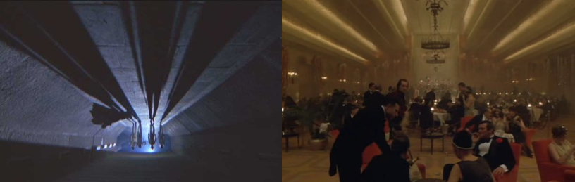 Basically it seems that each set mirrors the other....they seem to fit together and the various items seem to occupy the same places etc...candlesticks, chairs, pillars etc.  2001 is the light, The Shining (ironically) is the dark and that would also be true in a personal sense too...Bowman reaching enlightenment, Jack death & an earth (duat) bound rebirth.  Both the sets also seem to be symbolically conveying that they (in one form) represent the same concept, that being 'As above, so below'....which I'll mention again soon.