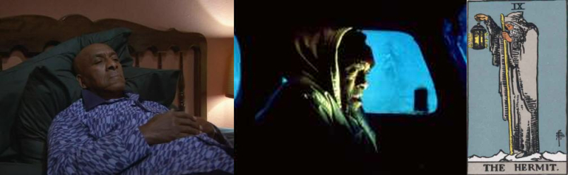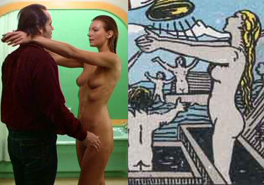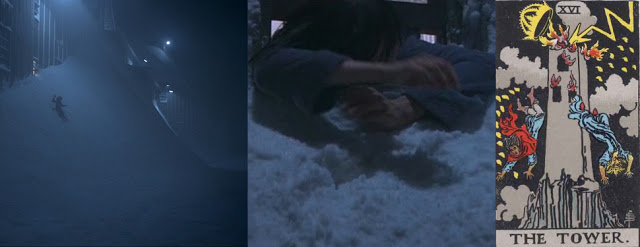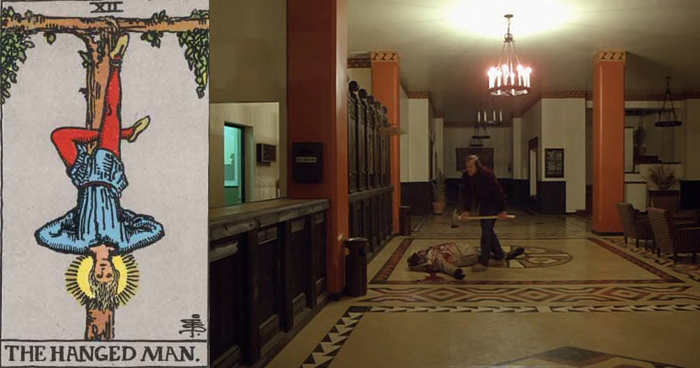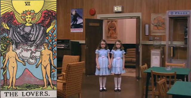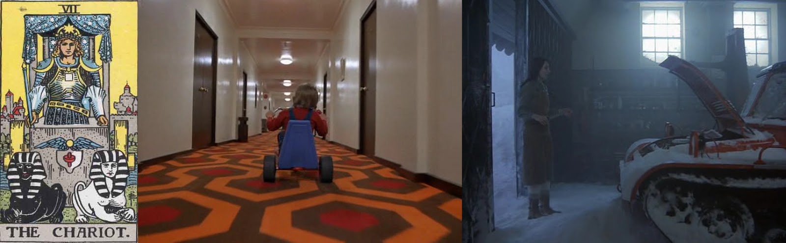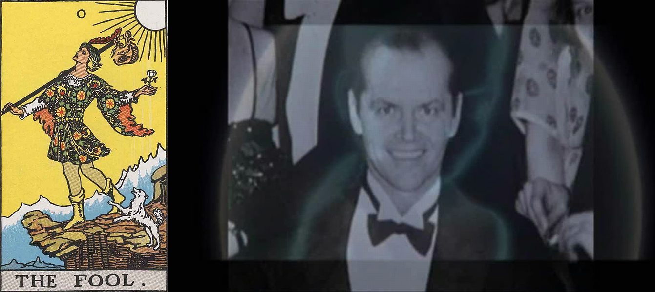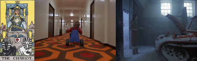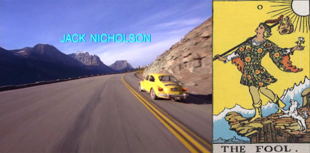 The opening shot of Jack in his car on the way to the Overlook (going to the sun road)...even the Tarot card itself has reference to the 'shining' sun across the 'snow peaked' mountain tops...just like the opening section of the film itself! The fool is on the edge of a precipice, about to enter his journey...as is Jack, his car is running along the edge of the mountain road, about to enter his journey.