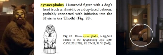 Of course, this doesn't preclude the 'abuse' concept or Danny & the bear as a metaphor...it just adds to the layers.  I have flipped the Dog/Derwent image to compare to the anubis/amemet image, at the moment of 'judgment'....remember this scene is in the closing minutes of the film, very close to Jack's death....this seems to be a portence of what is to come re: Jack and his own 'judgment'.  Derwent is in Anubis' seated position and the Dog-bear is assuming the position of  Amemet/Cynocephalus (see the front legs, same position) who looks over his shoulder to Thoth (aka Hermes, not pictured) awaiting the fate of the judged heart, for he will swallow it, if judged negatively (remain in the duat/earthly realm).