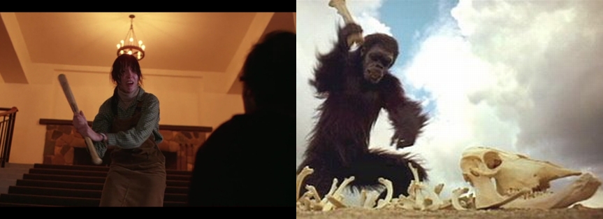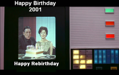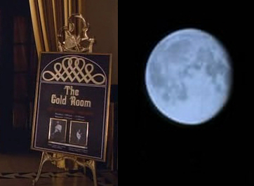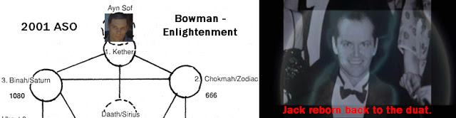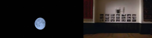 From doing this we should see the following outlined...a death/rebirth cycle cross-over (with reference to reincarnation and/or a trapped soul on earth) and that will be both visually and audibly! We will also see perhaps why Jack is posed as 'baphomet' in the Overlook Ball painting and what the 'star child' is really doing at the climax of 2001:ASO.  We should also be able to understand why 'The Gold Room' sign is positioned in the closing sweep shot at the end of The Shining and how that relates to the closing moons shots at the end of 2001.
