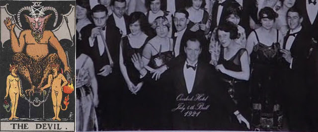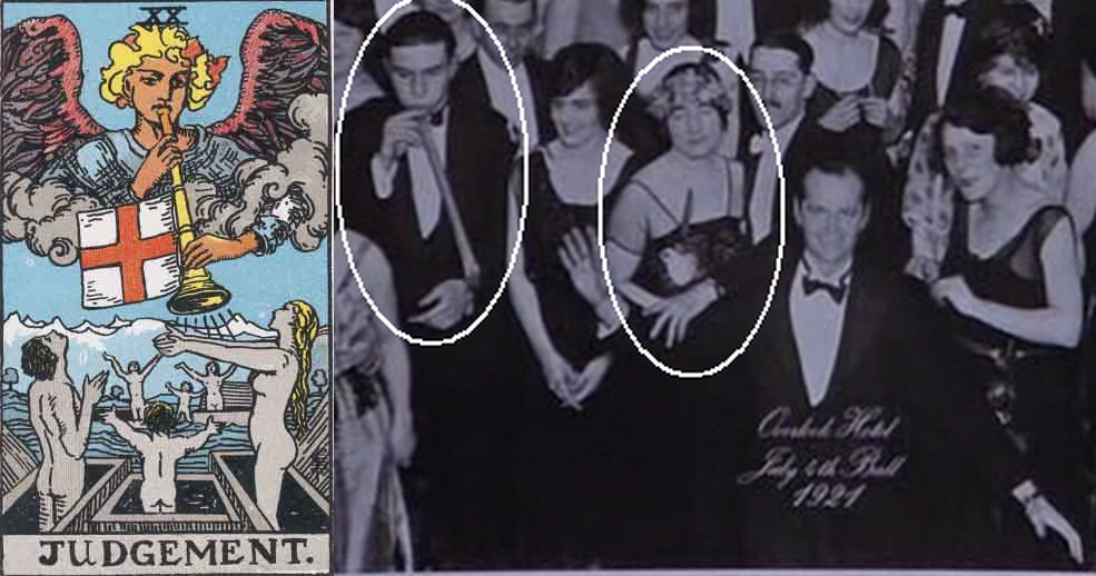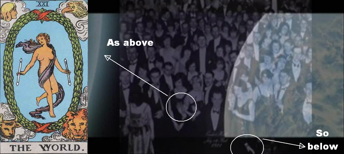 "That which is Below corresponds to that which is Above, and that which is Above, corresponds to that which is Below". An Hermetic doctrine...Macrocosm & microcosm, which we explained earlier. Baphomet the beast...Black Jack, 21 photos (a jack & an ace, 21 in black jack/pontoon, date 1921.)  21 cards of the tarot major arcana...with The Fool as 22 and 0, the alpha & omega, the beginning and the end.  21 could also refer to 2001, the other aspect of the combined synch...2001 without the value of the zero's = 21.