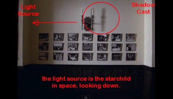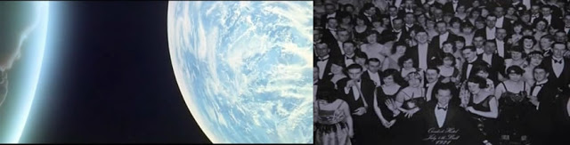 So we're getting the reborn 'star child' from the space hotel (room) 'overlooking' the ball shaped planet (macrocosm)...where in synch, he seems to be looking at the photograph of the Overlook Hotel, Ball (microcosm)!  The photo has Jack in it (who we have just seen frozen to death) and therefore would seems suggestive of reincarnation.  Death of Jack to the birth of the 'star child' and/or the rebirth of Jack...a cycle forever & ever...like a trapped soul.