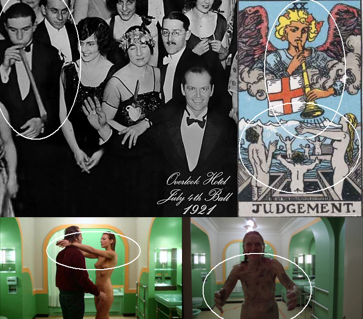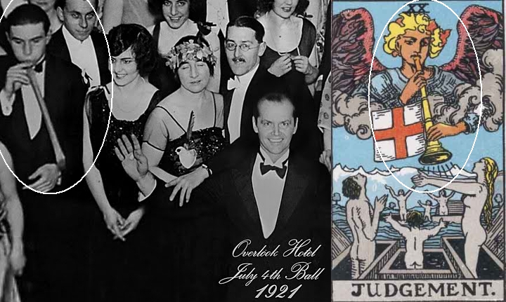 Re: The synch...now if you have the music playing from 2001 : ASO (Thus Spake Zarathustar/the world riddle) and The Shining together...you'll hear the very loud 'brass' sound of horns when we see this picture and the man with the party blower...denoting the horn of judgement blowing! (i only used the sound from The Shining, this time...so as not to confuse things too much, but it is important to realise the aforementioned 'horn' music!