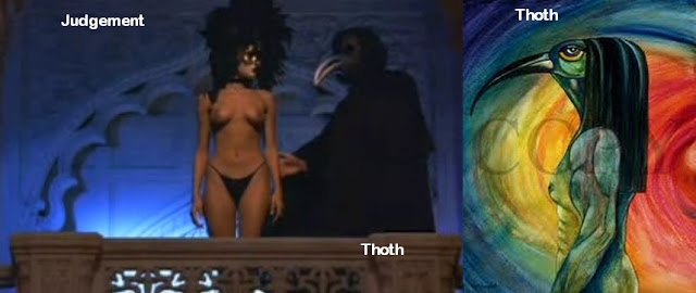 (Just for the record....Thoth/Hermes can also appear as a dog faced baboon or a man with the head of a baboon when he is A'an, the god of equilibrium...so he is connected to the 'baboon' too.) The equilibrium being connected to the scales and balance etc...so that is easy to understand why, given the mythology and characters present.