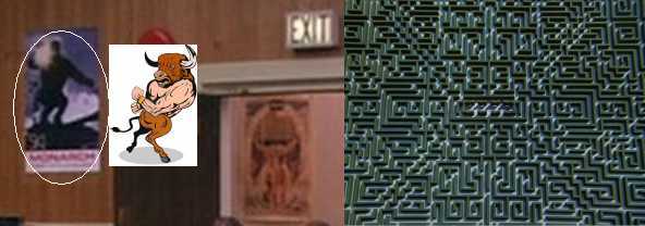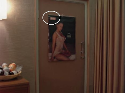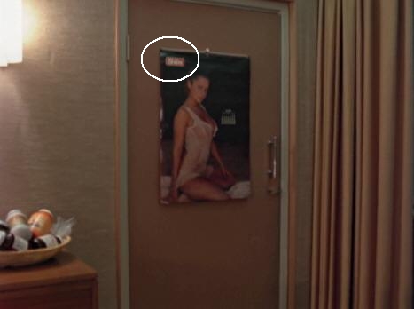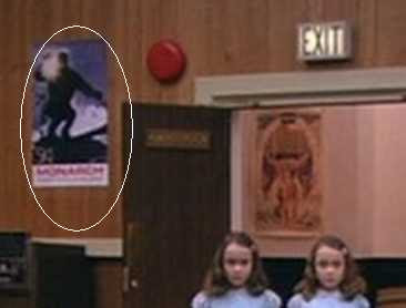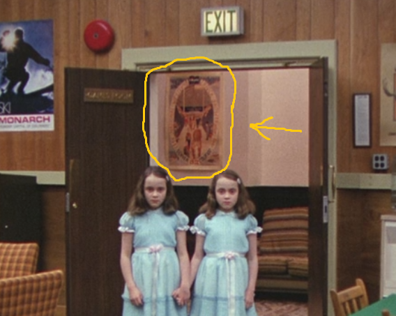 Note...it almost looks like the photo poster of the skier has been 'augmented' to some degree to mirror the 'haunches' of the minotaur...even got a tail-like protrusion!  The poster below the 'exit sign' looks like the head and horns (centre) of a bull/cow.