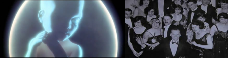 Note the music 'Al Bowlly'....Midnight, the Stars & You...this is very suggestive of the 'star child' and his position in space (in the stars) and if we run with the idea that it's a New Year's Eve Ball (not July 4th) then this photo (Overlook 1921 Ball) would be taken at midnight"Midnight and a rendez-vous"...to 'meet at midnight' and to 'solve et coagula' (separate & bring together).   Watch in the 'synch video' how Jack & the 'star child' seem to be merging into one another....a rendezvous (see next pic).
