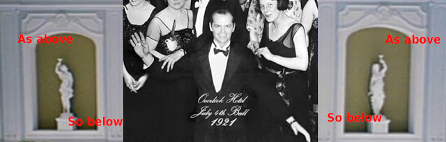 Both of these doorways and backgrounds will represent the concept of 'as above, so below' as you will see...later.  The 'space hotel' monolith and background represents 'as above, so below' and the 'overlook hotel, doorway and background/photograph represent 'as above, so below' they're symbolically trying to convey the same concept.