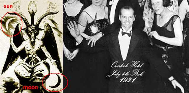 What about the all important photograph?  Jack posed as baphomet (the androgynous god & also a dead ringer for Pan) let's take a look.  (note...Another aspect I've considered re: baphomet is his/her connection to sodomy and that obviously has ties to Jack & Danny's relationship & abuse scenario.