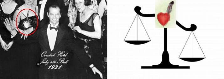In the Duat, the Egyptian underworld, the hearts of the dead were said to be weighed against her single "Feather of Ma'at", symbolically representing the concept of Maat, in the Hall of Two Truths (Overlook lobby hall).  A heart which was unworthy was devoured by the goddess Ammit (Amemet/Cyncocephalus) and its owner condemned to remain in the Duat (earthly plane). The heart was considered the location of the soul by ancient Egyptians. Those people with good and pure hearts were sent on to Aaru (afterlife, ascendence).
