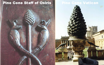 The 3rd Eye/Pineal Gland represented as a pine cone.  Osiris' staff showing a very close similarity to the caduceus of Hermes/Thoth.  The pine cone...Vatican City (right).
