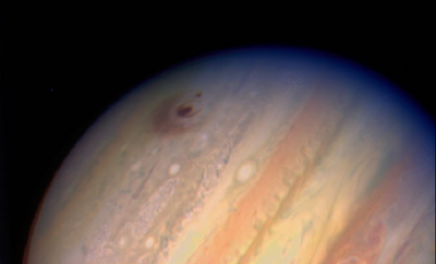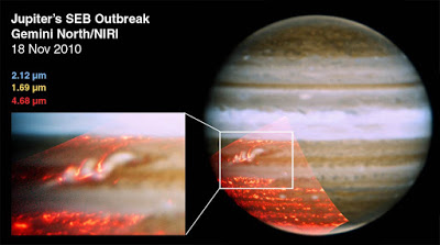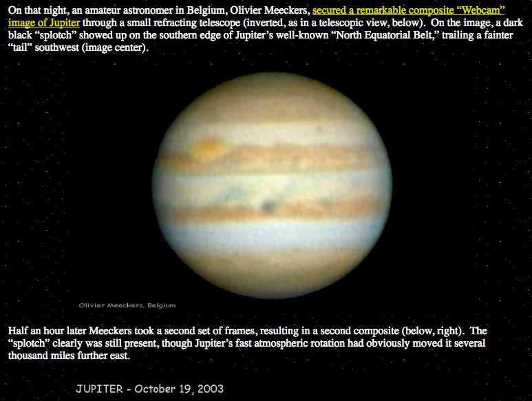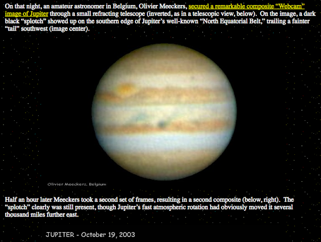 Almost ten years earlier (before Galileo's plunge) – in July, 1994 (and 10 years after Hyams/Clarke's 2010 film) –equally dramatic black markings had suddenly appeared in Jupiter’s atmosphere (below). Then, the cause was crystal clear: the impact of some 21 pieces of a stunning celestial object named “Comet Shoemaker/Levy 9.” It was this same Galileo probe that recorded the actual impact.