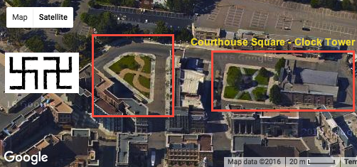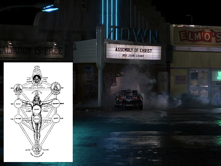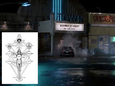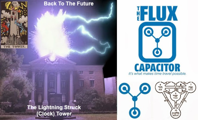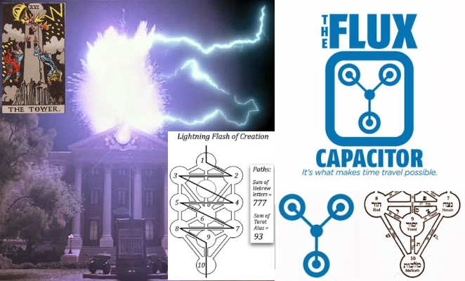 Tree of life/flux capacitor, a version of which is in the car and at the front of the clock tower. The lightning bolt travels from the top/crown to the bottom/earth, the Hebrew values of the letters of the paths it takes, summing '777'. We also noted the distinct White House (front) similarities and 'phallic' tower overlaps.