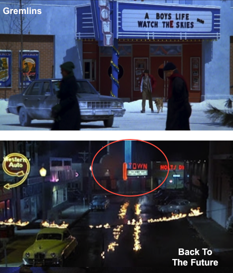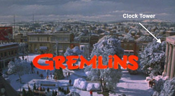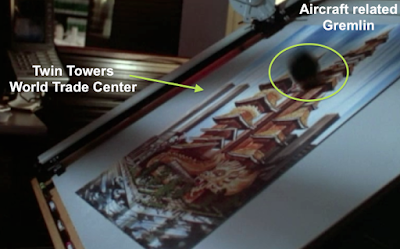 Spielberg/Zemeckis' 'Back To The Future' series was also very 9/11 and 'struck Tower' resonant, all previously covered. Below, 'Trade Centre' Clamp battles/shreds a gremlin with WTC (picture) in the background.
