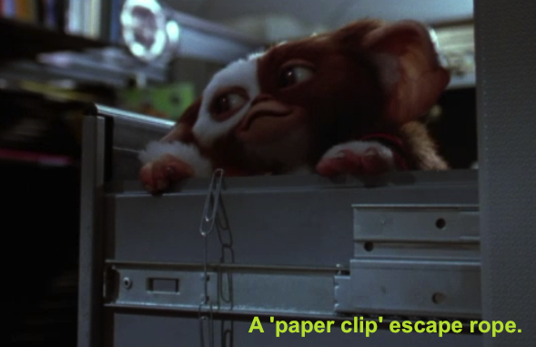 It's not my fault, but there is a Gizmo 'paper clip' (drawer) escape scene within Gremlins 2!