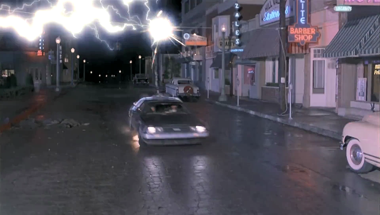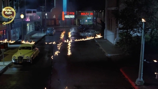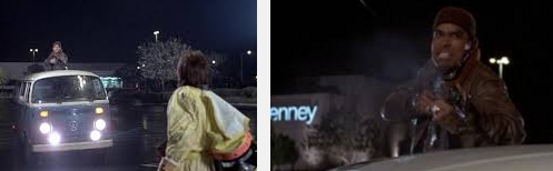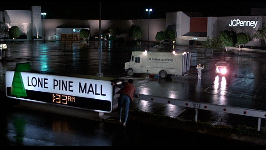 This 1955 'clock tower replay' scene ends the sequel, but the original film's immediate and following 'Libyan' aspect, is not tacked on this time (Doc was saved in the first film, so there is no need). We just get a 'To Be Concluded' segue/card. The Libyans will be evoked in the viewers memory though. The 'To Be Concluded...' phrase has an 'arrow' pointing to where the Libyans 'drove by' in the original film.
