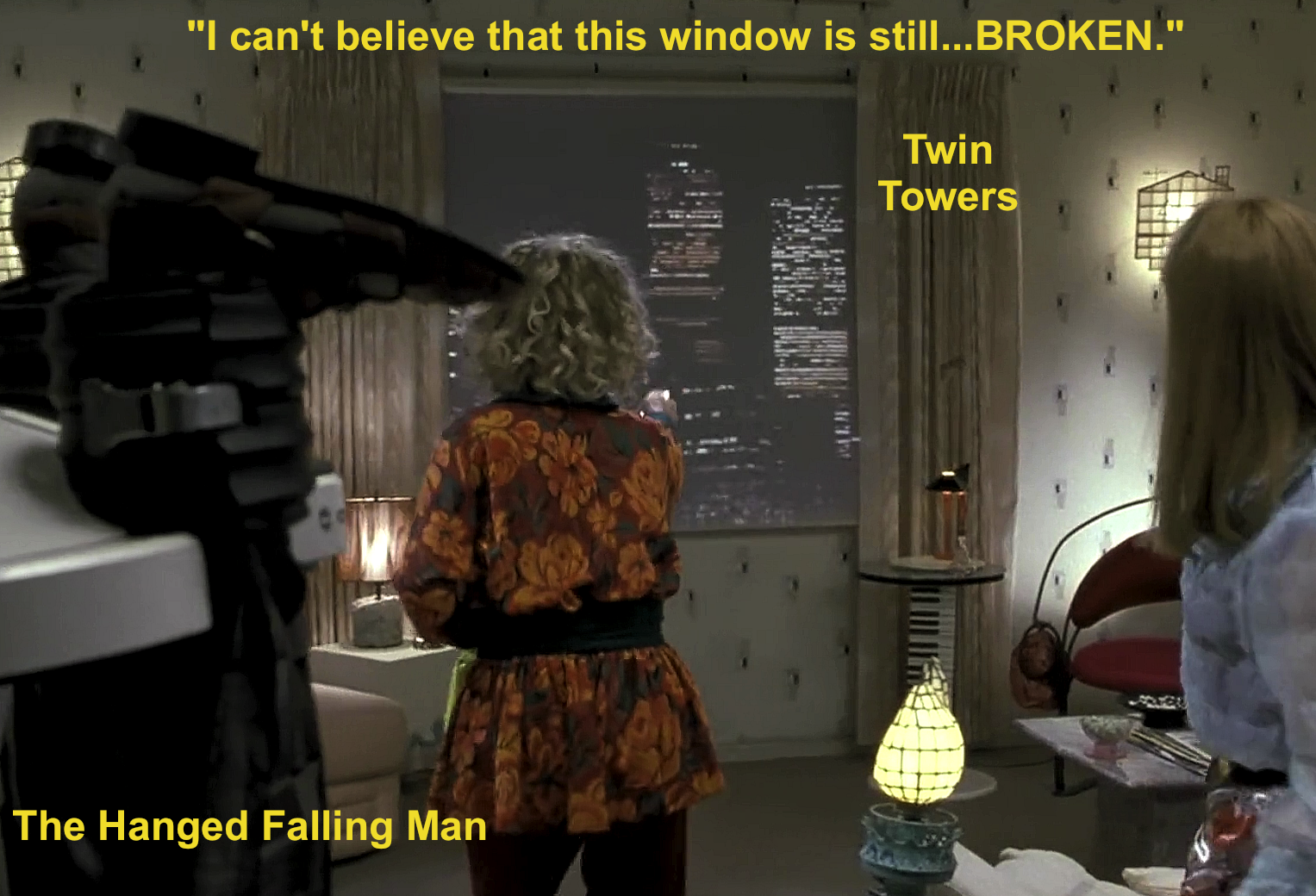 The Twin Towers also briefly feature in the sequel (see TV window). Watch the scene, the screen scrolls upwards a couple of times, evoking the falling WTC hanged man.