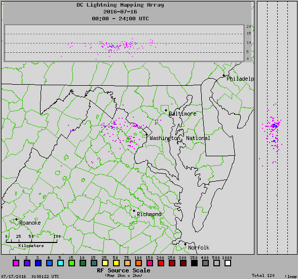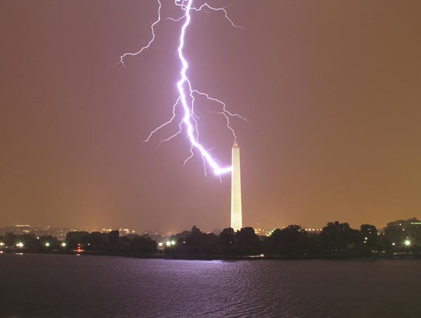 There were a few reports about lightning strikes hitting (washington monument), but the pics are very poor, there may have been a few of these very small strikes, certainly nothing major though. There was certainly lightning in the general vicinity though, which is interesting enough in itself, see pic.