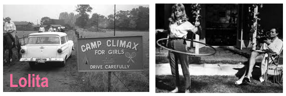 In the ring/hoop with Lolita and via camp climaxing (underage anal sex). That's the girl that sick Kubrick/Sellers abused!