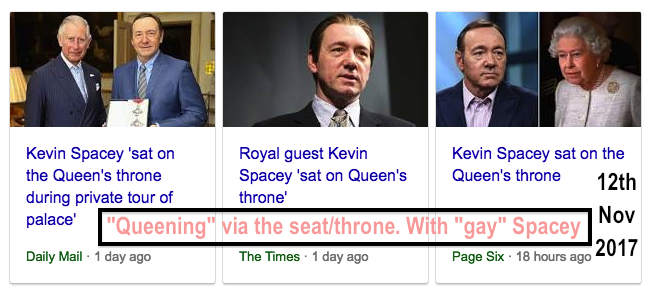 Kevin "Queening/Gay" Spacey via the seat and The Queen. The monarch who is married to "Phil the Greek".