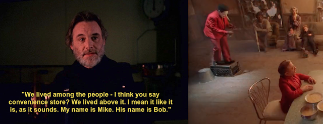 Convenience Store scene - the exact time (10:10) and date are very specific for this sequence. He clearly refers to the fact that Gordon is previously aware of the details of Cooper's prior dream (Cole's "I know" line). Cooper dreamed this would happen (Bowie turning up at the FBI office, hence Cooper looking for him via the CCTV) and then the dream plays out in real 'film' life, and at the exact time that he was given in his dream. A total WTF scene! Lodge inhabitants (it is implied) are able to travel via electricity and portals, which explains Bowie's sudden disappearance.