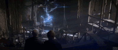 Cooper and a strange woman emerge from a metallic type of unit suspended in space, a lever is pulled.
