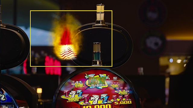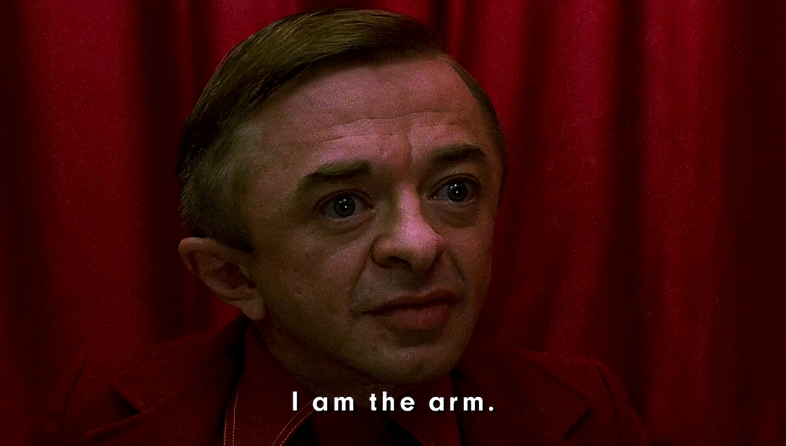 Evoking the lever pulling "God" from Eraserhead. This lever pulling will be evoked again via the casino and "one-armed bandits" (fruit machines). Geddit, a one-armed "777" bandit (like one-armed man).