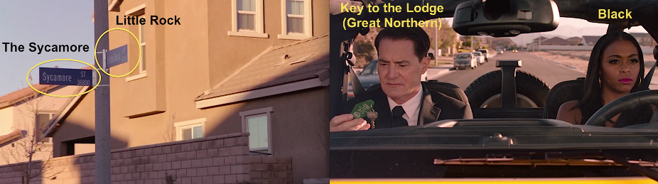 Black female hooker "Jade", which is also a type of rock and related to the colo(u)r black. Black jade rock is also related to 'protection' of the etheric body from negative or destructive forces. During Cooper's drive with Jade he drops the room key and avoids being shot by a negative force - the sniper.