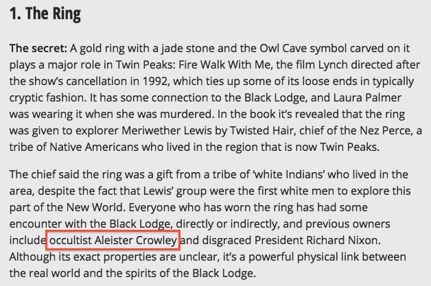 "The name Hermes (he of the emerald table) is derived from "Herm," a form of CHiRaM (CRM), the Personified Universal Life Principle, generally represented by fire ("fire walk with me"). The Scandinavians (note, Twin Peaks' Norwegians) worshiped Hermes under the name of Odin; the Teutons as Wotan, and certain of the Oriental peoples as Buddha, or Fo.