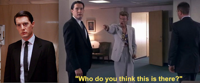 Is FBI Jeffries (Bowie) trying to indicate that Cooper is not what he seems, or that he might become not what he seems (as in possessed)? This would be precognition of the future, FWWM being the last seven days of Laura, the TV series starting with the discovery of her body. The Bowie scene takes place in Phila-DELPHI-a, Delphi, the oracle - dreams, future telling etc. Cooper begins the scene mentioning his dream to Gordon. We also know he has had prior dream/vision contact with Laura because it's shown via the film's Tremond/Chalfont picture frame dream - advising her not to take the ring.