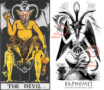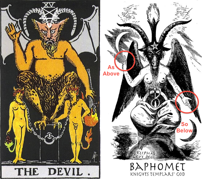 The (tarot) Devil, fire and Baphomet - adopting the sign/gesture of "as above, so below" (as per the tablet).