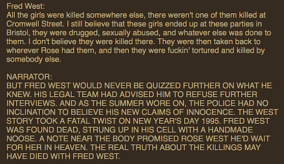 When the police turned up at the West home with a warrant to examine the garden, Fred was not there. He was some 20-30 minutes away. It was Rose that called him, to inform him of the police's presence. It took Fred West over three hours to make his way home. What happened in that 3 hour + window. Was he away destroying evidence, tying-up loose ends and being briefed by (connected) senior cult members on how to proceed?