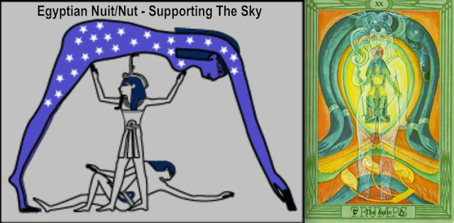 There might be a symbolic link to Nuit/Nut, Egyptian goddess supporting the sky. As reflected in the Crowley Thoth tarot card "XX - The Aeon/Judgement". The Crowleyian Thelemic bible (Book of Law) was written as result of his "Great Pyramid" meditations, and via partner Rose Kelly and 666 Horus. Skywalking - a la the Ancients image below.