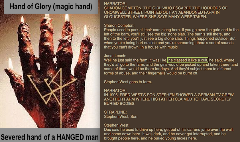 The West's satanic links have always been underplayed and not been thoroughly combed through by MSM. Issues pertaining to "black magic/satanism" and god knows how many missing body parts/bones (270+ can be established from interviews), notably dozens of finger and toe bones. Fred West would even reference "FINGERpost Hill/Field" - where he left the body of his former wife and another former lover (nearby). The location is given as the burial site of his (official) first victim, who would actually be last discovered - bookended via Fingerpost.