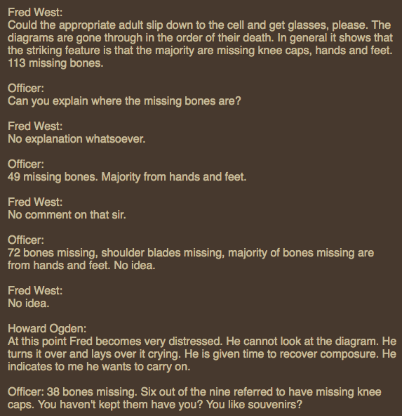 Fred West seemingly had little trouble describing how he (allegedly) murdered his own daughter (Heather), chopped up her body and then put it in a bin. However, ask him about what happened to dozens of missing bones (from the bodies), he completely shuts down and sobs. Is this reaction due to the fact, that the bones are used in rituals/ceremonies and for necromancy purposes, and the tears are his escape from such questioning? Very likely, imo.