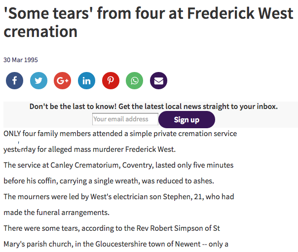 The actual locations of almost all the burial sites of victims—both discovered and undiscovered—was symbolic to Fred, as each had been buried at or very close to the location he had lived in or worked at at the time of the victim's murder. (This claim was later supported by criminal psychologists).