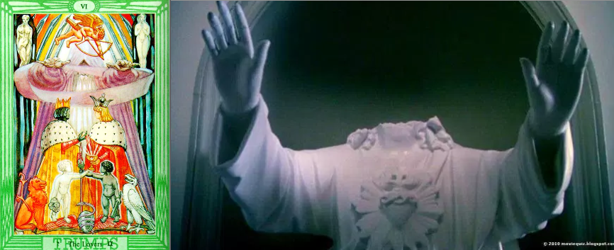 Don't forget, this film also features "The Hanged Man" (tarot), whose "left hand" is the literal "hand of glory". Gemini, of course, also a clear tie-in to the tarot via The Lovers (Twins). Crowley's Thoth tarot is reproduced below, this would be the "Gemini" relevant trump, relating to an 'arch of swords' (surrounding cupid). See my Exorcist posts for more on the tarot elements.